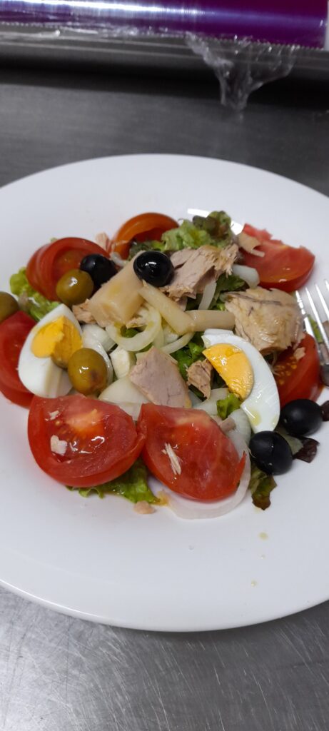 Salmón al horno con verduras asadas o tortilla de espinacas con una ensalada.